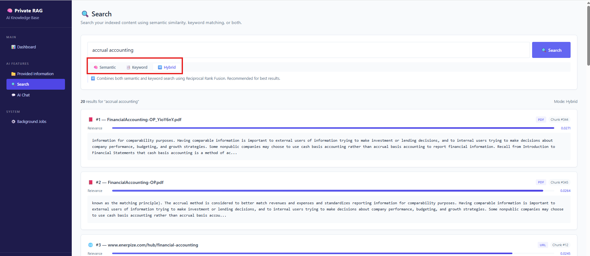 Content is indexed using both semantic vector search and keyword-based (Lucene) indexing, enabling hybrid retrieval strategies that balance precision and recall. This allows users to query their data using semantic understanding, exact matching, or a combination of both.