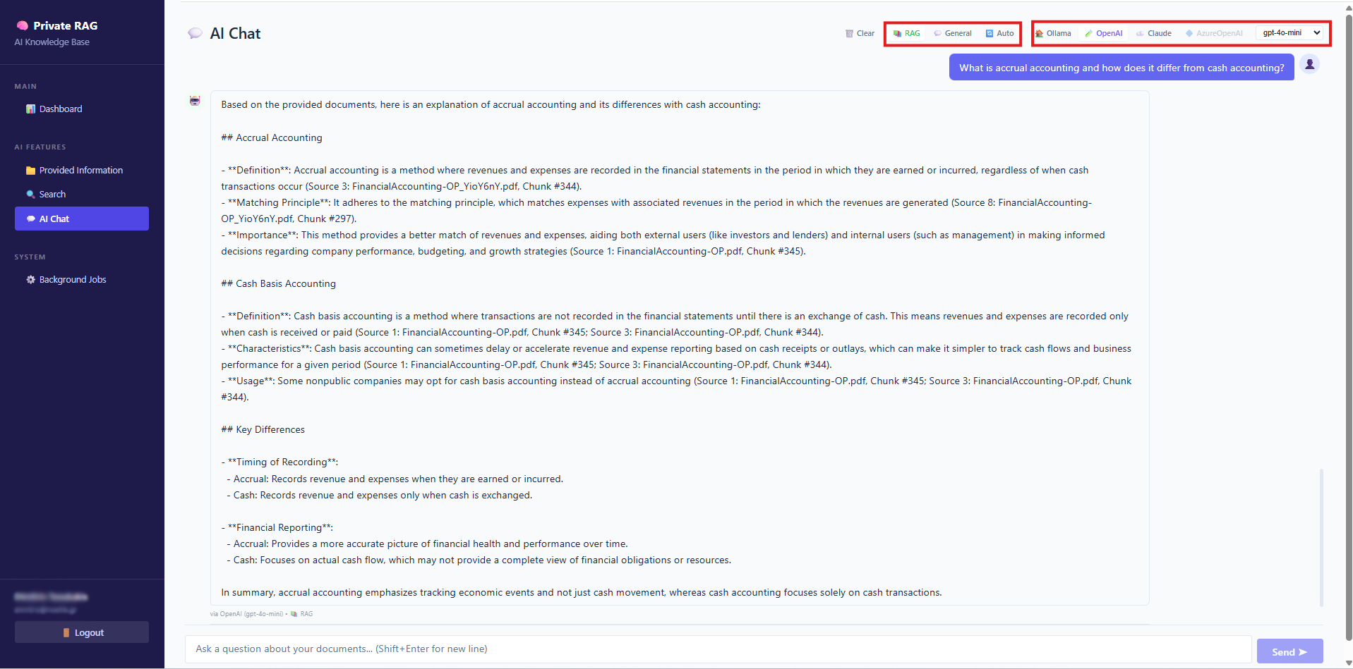 On the inference layer, the system provides flexible reasoning options. Organizations can choose to run models locally (e.g. via Ollama) for maximum data control, or leverage enterprise-grade APIs such as Anthropic, OpenAI, or Azure OpenAI. Additionally, users can control how responses are generated by selecting between strict RAG (fully grounded answers), general knowledge mode, or hybrid approaches that combine internal data with model knowledge.